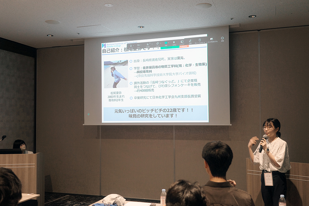 佐世保高専に所属する松尾亜弥さんは、自身が行っている味覚受容のメカニズムに関する研究を専門的ながらもわかりやすく紹介しました。また、地元・波佐見町に対する愛着や、今後研究を続けていくうえでの進学資金や就職選択に関する等身大の悩みも共有され、会場からは温かな共感が寄せられました。