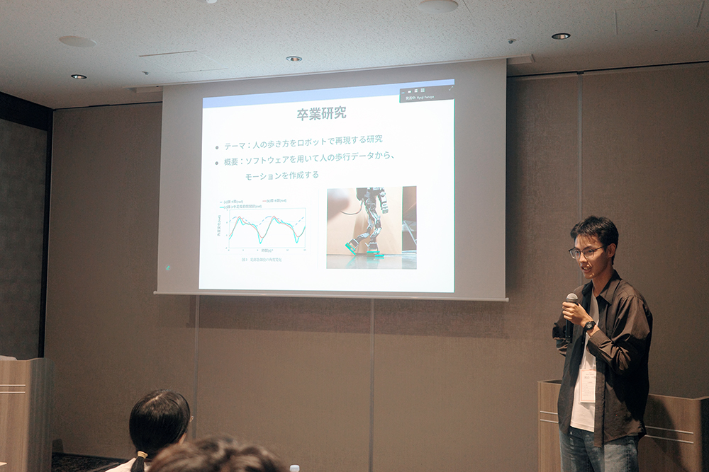 1人目の九州大学の中野哲志さんは、大分高専の卒業生です。自身の祖父母が農業従事者であることをきっかけに感じた現場の課題や日本の農業従事者減少といった社会問題に触れながら、農業の現場に寄り添うロボット開発への志と、「学業に集中できる環境をいただいたからこそ、研究と挑戦を深めたい」という財団への感謝の気持ちを述べました。