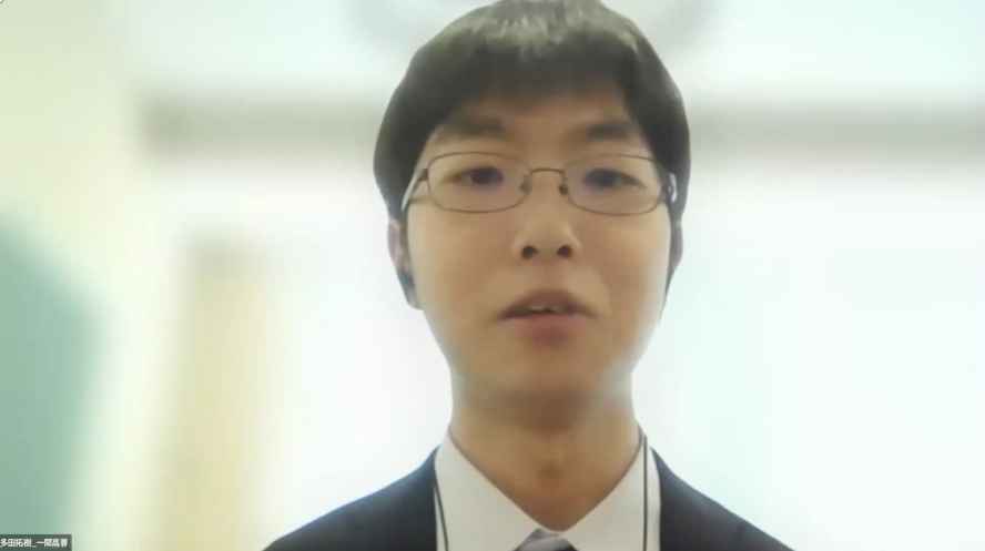 続いての一関高専の多田拓樹さんは、家庭の経済的事情に加え、幼少期から1型糖尿病と向き合ってきた当事者として、医療機器開発への思いを語りました。現在は高専で医療機器開発の基礎となる電気電子工学の知見を深めているという多田さん。これまで直に感じてきた治療にかかる負担や既存機器の課題を研究の原動力に変え、財団からの支援を糧に「病理解明と実用化に資する機器開発へ邁進する」と意気込みを語りました。