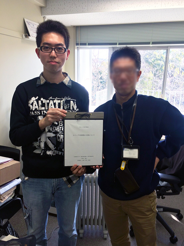 ▲大学時代の久保田先生。卒業論文と指導教員と一緒に
