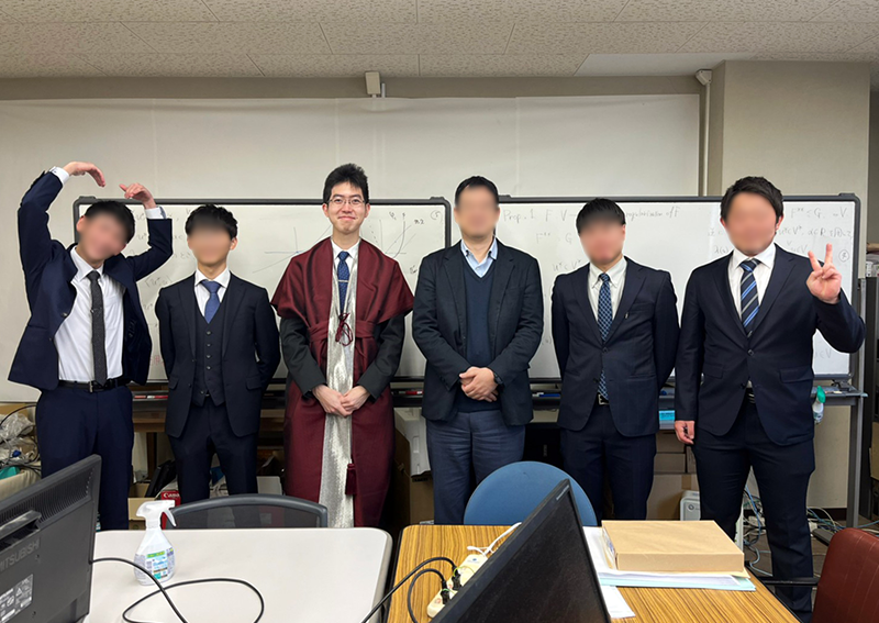 ▲博士修了時の久保田先生。当時の研究室生と指導教員と一緒に