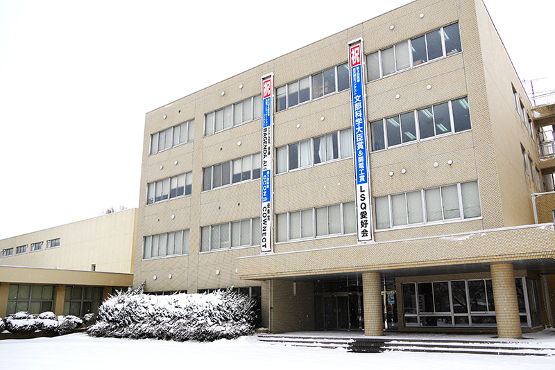 ▲雪が積もる函館高専。各種コンテストでの受賞を称した垂れ幕もあります