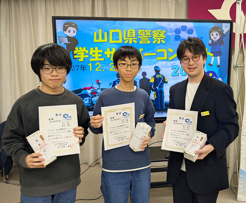 また、在学中には山口県警主催のサイバーコンテストにも2回出場しました。最初に出場したのは本科5年生の時です。サイバー攻撃を受けた想定で、チームメンバーで協力しながら運営サイトにおける防御対策を講じるというものでした。
