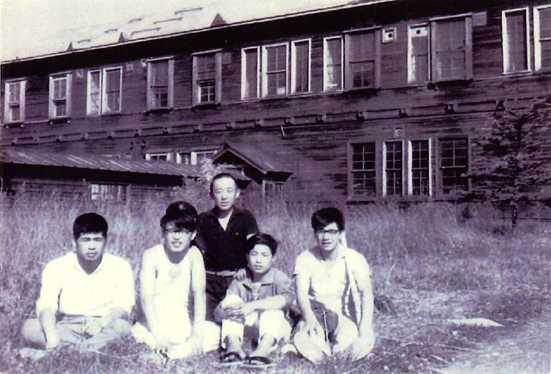 ▲寮生のみなさんと(村上さん:左から2番目)。後ろの建物は旧日本陸軍第7師団兵舎跡で、1階が寮、2階が教室になっています